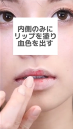 唇の輪郭の色をコンシーラーで消し、中央にリップをオンすることで、じゅわっと