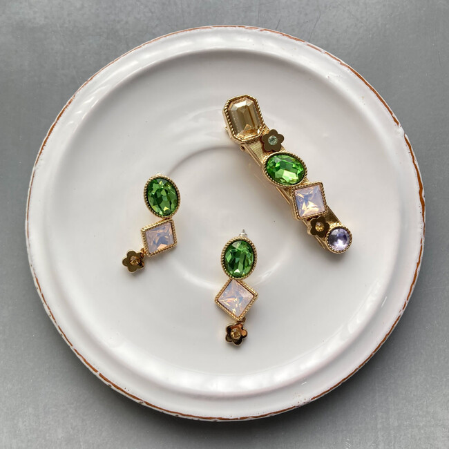 形、カラー共に異なる大ぶりのビジューを使用した目を引くデザイン