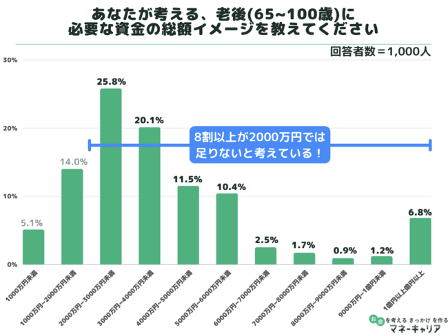 「老後(65~100歳)に必要な資金の総額」を尋ねたところ、8割(80.9%)は2000万円では足りないと考えていることが判明。「2000万円~3000万円未満」と回答した人を除いても、2人に1人は老後3000万円以上必要と考えていることがわかりました。