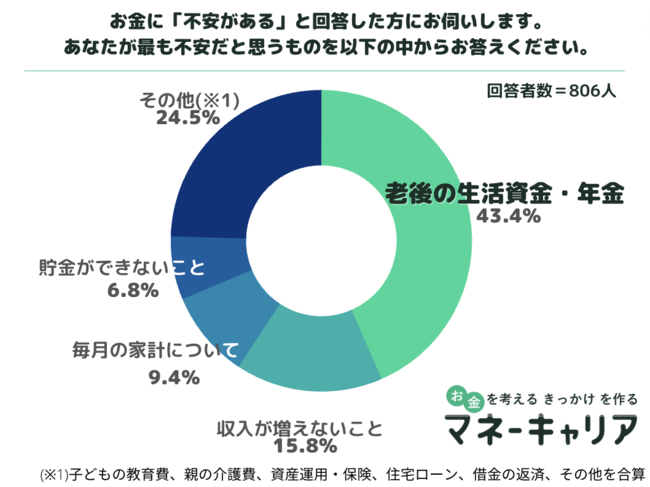 「お金(収入・貯蓄・資産形成)について不安がある」と回答した人に「最も不安なもの」を尋ねたところ、1位は「老後の生活資金・年金」という回答が約4割(43.4%)を占め、2位の「収入が増えないこと」の約2割(15.8%)と27.6ポイントの差がありました。