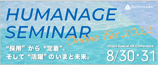 人材の“採用”から“定着”、その先の“活躍”までを支援する人材サービス事業を展開する株式会社ヒューマネージ(本社:東京都千代田区、代表取締役社長:齋藤 亮三)は、2022年8月30日(火)、31日(水)の2日間、無料オンラインセミナー「HUMANAGE SEMINAR -Online Fes 2022- “採用”から“定着”、“活躍”のこれから」を開催いたします。