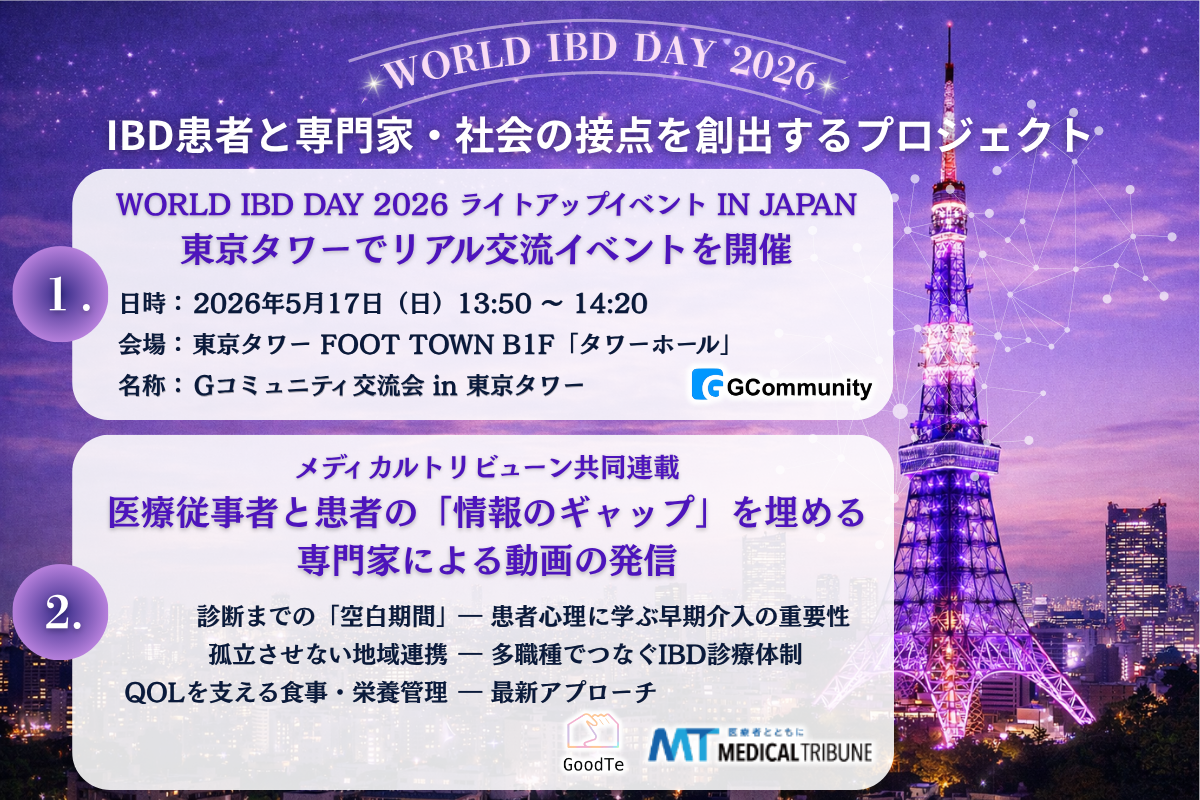 潰瘍性大腸炎やクローン病などの炎症性腸疾患(IBD)患者向けに、日本最大級のオンラインコミュニティ「Gコミュニティ」を運営する株式会社グッテ(本社:東京都千代田区、代表取締役:宮崎 拓郎)は、2026年5月17日(日)に開催される「WORLD IBD DAY 2026 ライトアップイベント IN JAPAN」に参画いたします。当日、東京タワーでIBD啓発の紫色のライトアップが実施されます 。弊社はこの歴史的なイベントにおいて、公式トークセッションへの登壇や患者交流会の開催を通じ、疾患への理解と支援の輪を広げてまいります。また、医療情報メディア「Medical Tribune」との共同企画として、診断の遅れや地域連携、最新の栄養管理をテーマとしたWEBコンテンツを掲載し、医療現場と患者心理の橋渡しを行います。