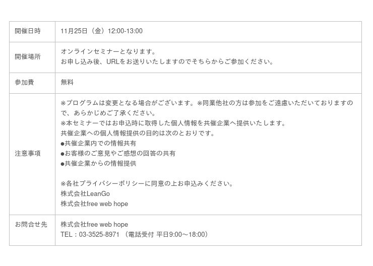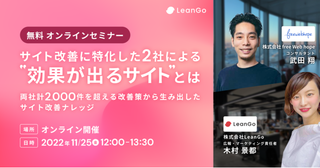 株式会社LeanGo(本社:東京都品川区、代表取締役:平井 翔吏)は、株式会社free web hope(本社:東京都千代田区、代表取締役:相原 祐樹)と11月25日(金)12:00~13:30に無料オンラインセミナーを開催いたします。