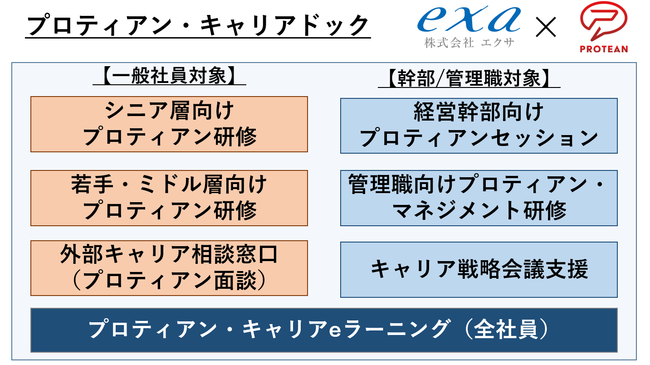 エクサの中長期成長に向けた組織改革におけるキャリア自律支援として、キャリア自律最先端知見である現代版プロティアン・キャリアを全面的に導入頂きまして組織改革に伴走いたします。なお、提供サービスは、以下の通り全社員にプロティアン・キャリアeラーニング導入しキャリア定義を共通言語化したうえで、キャリア相談窓口支援、管理職向けセミナー、ワークショップ、ミドル、シニア向けのキャリア研修,キャリア資産可視化診断を通じてexa wayを実現する人材の創出を支援させて頂きます。