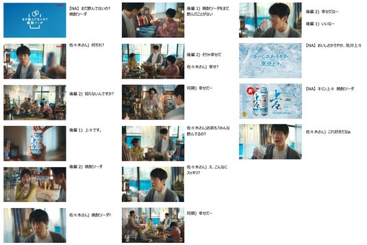 お酒好きで好奇心旺盛な性格の佐々木さんは知らない缶を見るとすかさず「なにそれ?」と興味を示しますが、後輩から逆に「え?知らないんですか?」と返されてしまいます。他の3人はすでに焼酎ソーダと出会っている様子で、「焼酎ソーダをまだ飲んだことがないなんて・・・そりゃあ幸せだ!」と羨ましそうな様子。気になり始める佐々木さんが「幸せ?」と聞き返すと、全員から「幸せ、幸せ」「幸せ者~!」と1人だけ知らない佐々木さんをいじりだす展開に。佐々木さんは、いてもたってもいられず「キリン 上々 焼酎ソーダ」をグラスに注いで一口飲んでみると「・・・え?こんなにスッキリ??」と驚きとともに無邪気なリアクション。佐々木さんの新鮮な表情を見た3人は、本格的なのに軽やかな焼酎ソーダという新しいおいしさに出会った佐々木さんに「幸せだー!」「幸せだな~!」と声をかけます。上々に出会いさらに気分も上々になる佐々木さんに注目です!