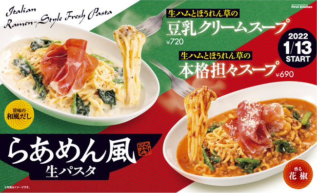 ファーストキッチン株式会社(代表取締役:紫関修 所在地:東京都新宿区)では、1月 13日(木)より、ウェンディーズ・ファーストキッチン店舗及びファーストキッチン店舗(一部店舗を除く)にて “らあめん風生パスタ”を発売いたします。全粒粉・小麦ブランを配合したもちもち食感のファーストキッチンオリジナル生パスタを使用した今商品は、スープパスタのようでちょっと違う!?本格的なラーメンのような奥深い味わいとなっています。お客様の注文を受けてから作り始め、ゆでたて・和えたて・出来立てを味わうことができるファーストキッチンの 生パスタを食べたいことがない方にも、ぜひトライしてみていただきたい逸品です。