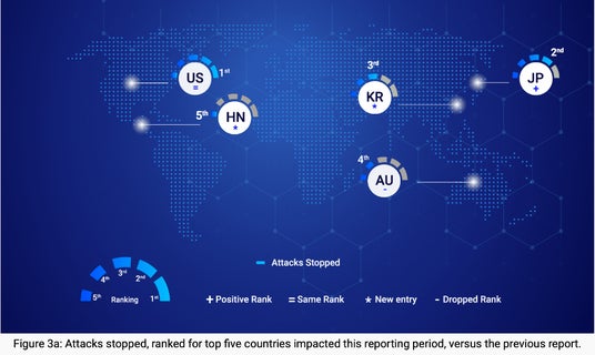 - 日本は、アメリカに次いで、世界で2番目に攻撃を受けた国となりました。新たなマルウェアの検出数では、アメリカ、韓国に続く世界第3位でした。APAC(アジア・太平洋)地域全体で見ると、日本と韓国、オーストラリアは高いレベルで攻撃を受け、世界の上位5カ国にランクインしています。