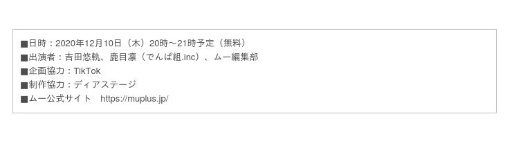 株式会社 ワン・パブリッシング(東京都台東区/代表取締役社長:廣瀬有二)は、2020年12月10日(木)にモバイル向けショートビデオプラットフォームTikTokを活用した生配信トークイベント「ムー TikTok LIVE 最恐都市伝説・鮫島事件 生解説&怪談トークSP」を配信します。「ムー」は1979年創刊の超常現象専門誌です。近年、月刊誌に加えてウェブマガジンやイベントにも進出し、UFO問題や心霊現象、都市伝説の謎を追求しており、2020年9月からは「TikTok」に参入。今回、ムー史上初となる「TikTok LIVE」で都市伝説の生解説を行います。