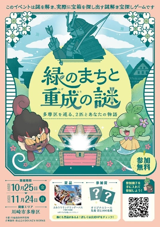 多摩区では、2020年より4年連続で、多摩区ゆかりの鎌倉武将「稲毛三郎重成」を題材にしたイベント「SHIGENARI」を開催してきました。第5弾となる今回は、「緑のまちと重成の謎」と題し、多摩区内の各地を巡って謎を解き、キーワードを集めながら重成が遺した宝箱を探し出すまち歩きゲームとなっています。どなたでも無料で参加でき、先着で参加賞を提供するほか、宝箱を探し出した方には抽選で豪華賞品をプレゼントします。