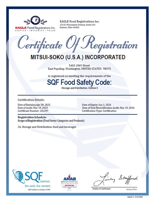 三井倉庫株式会社(本社:東京都中央区、代表取締役 社長執行役員:鳥井 宏、以下、「当社」)は、米国現地法人であるMitsui-Soko (U.S.A.) Inc.のロサンゼルスとシアトルの物流施設が、2025年4月に、食品の安全性と品質を保証するSQF(Safe Quality Food)認証を取得したことをお知らせいたします。