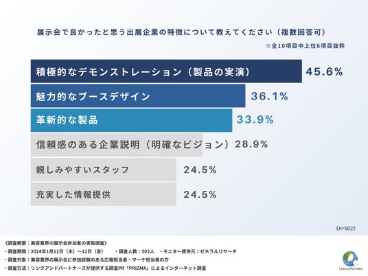 ・展示会で良かったと思う出展企業の特徴は、「積極的なデモンストレーション(製品の実演)」が最多の45.6%を占める結果に。