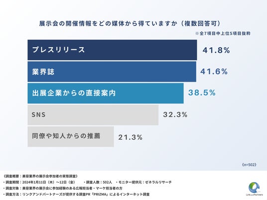 また、展示会情報の主要な入手源はプレスリリース(41.8%)で、展示会の情報普及においてプレスリリースが重要な役割を果たしていることを示唆しているといえるでしょう。