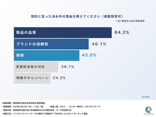 上記の調査結果から、展示会に参加する主な目的として、最も多いのは「新製品の情報収集のため」で48.6%、次いで、「業界の動向調査と競合分析のため」が41.8%、「自社製品の認知度を拡大したいため」が35.7%と判明しました。展示会参加後に、契約に至った参加者は32.9%で、その決め手は製品の品質(64.2%)、ブランドの信頼性(49.1%)、価格(43.0%)と明らかになりました。