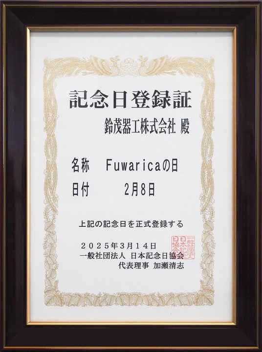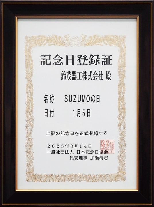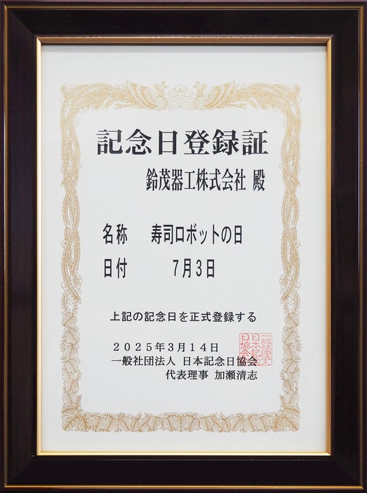 鈴茂器工株式会社(本社:東京都中野区、代表取締役社長:鈴木美奈子、以下 鈴茂器工)は、「寿司ロボットの日」「Fuwaricaの日」「SUZUMOの日」が記念日の登録と管理を行っている一般社団法人 日本記念日協会にて認定されたことをお知らせいたします。