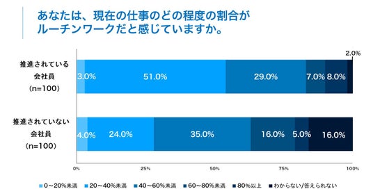 「Q5.あなたは、現在の仕事のどの程度の割合がルーチンワークだと感じていますか。」と質問したところ、推進されている会社員は「20~40%未満」が51.0%、「40~60%未満」が29.0%、推進されていない会社員は「40~60%未満」が35.0%、「20~40%未満」が24.0%という回答となりました。