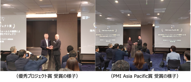 上記ファイナリストのプロジェクト6つと、奨励賞プロジェクト2つの、合計8プロジェクトの代表者が、10月22日にコモレ四谷タワーで行われた授賞セレモニーに招待され、弊社からはプロジェクト統括PMである野田坂 剛が出席しました。結果として、トレードワルツはファイナリストに送られる優秀プロジェクト賞に加え、特別賞となるPMI Asia Pacific賞を受賞しました。審査員となるSoHyun Kang(PMI Asia Pacific)からは、「国家を跨ぎ、言語の壁を越える必要があるタフなプロジェクトで且つブロックチェーンという先進技術のシステム連携にも関わらず、短期間で仕上げたこと」に関して高い評価のお言葉を頂きました。