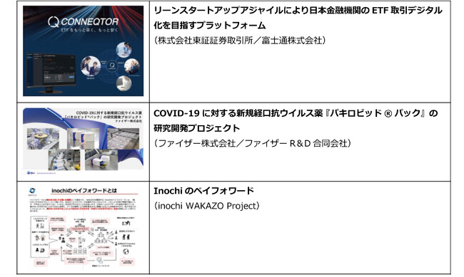 PM Award 2022では、厳正な書類審査の結果、弊社の「海外貿易プラットフォームとの連携による貿易手続円滑化プロジェクト」を含む下記6プロジェクトがファイナリストとして選出され、オンラインセミナーにて30分ずつの講演を実施しました。さらにそれを元に「新規性」「有用性」「組織の影響度」「課題への貢献度」の4つの基準で、約1,000名の一般投票により各表彰プロジェクトが選定されました。