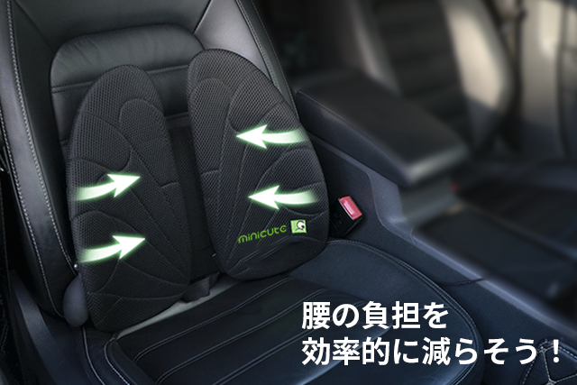 日々の仕事や運転で長時間座りっぱなしにすると、腰がガチガチになりやすくなります。そんな時に「Minicute Pro(ミニキュート プロ)」を使って、背もたれで支えることで、腰をサポートするのはいかがでしょう?