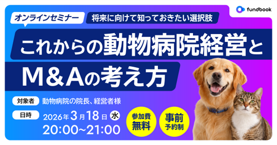 fundbookはこれまで数多くの企業のM&A支援を行ってきましたが、動物病院という専門性の高い分野においては、現場に精通したパートナーとの連携が不可欠だと考えました。業界特有の経営課題や実情に深い知見を持つ株式会社アスコと協業することで、動物病院の経営者の方へより実践的で信頼性の高い情報をお届けできる体制を整えています。今回、株式会社アスコとともに動物病院の経営者様へ情報を提供する取り組みの一環として、動物病院の経営者様向けオンラインセミナーを開催いたします。