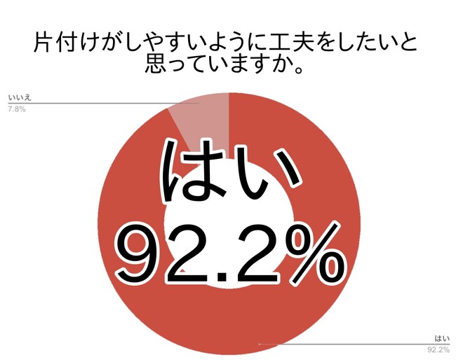 片付けがしやすいように工夫をしたいと思っていると答えた方は関東で9割超(92.2%)でした。全国では93.6%で、全国的に9割を超える高い割合であることがわかりました。