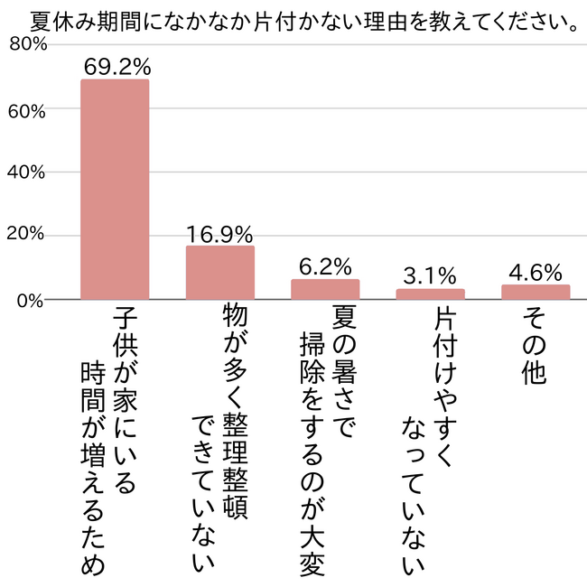 夏休みはいつもより部屋が片付かないと感じる方がほとんどだとわかりましたが、その理由はなぜでしょうか。アンケートで尋ねてみました。