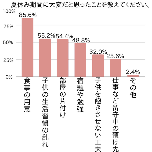 9割以上の方が大変と感じている子供の夏休み期間の対応で、具体的にどんなことが大変と感じるのでしょうか。アンケートで尋ねてみました。