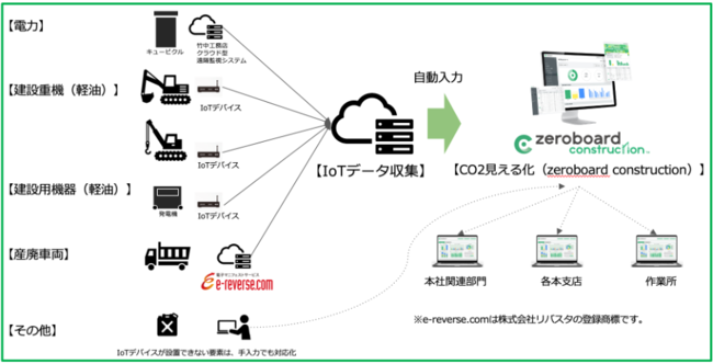 このたびの取り組みでは、IoTデバイスおよびデータ収集プラットフォームと「zeroboard construction」のデータ連携により、建設現場全体のGHG排出量を日次単位で効率的な算定・可視化、管理が可能となります。