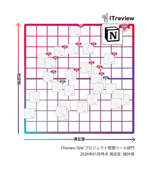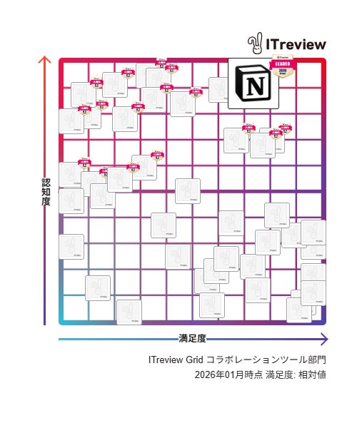 Notion Labs Japan合同会社(所在地:東京都、ゼネラルマネジャー アジア太平洋地域担当:西 勝清)は、アイティクラウド株式会社(本社:東京都港区、代表取締役社長兼CEO:黒野 源太)が運営するビジネス向けIT製品・クラウドサービスのレビュープラットフォーム「ITreview」のアワード「ITreview Grid Award 2026 Winter」において、コラボレーションソフトウェア「Notion」が「コラボレーションツール」「プロジェクト管理ツール」「タスク管理ツール/ToDo管理」「業務可視化ツール」「AIライティングツール」「文章生成AI」「AI議事録自動作成ツール」の7部門で「Leader」に選出されたことを発表いたします。「コラボレーションツール」部門では19期連続の受賞となりました。