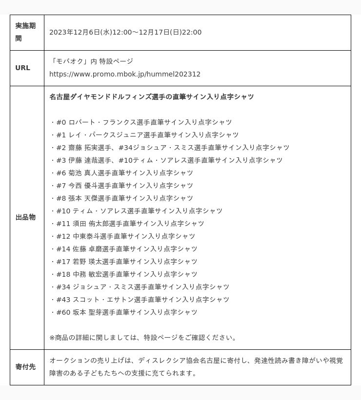 【名古屋ダイヤモンドドルフィンズhummel点字シャツチャリティーオークション概要】