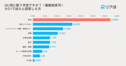最も多かったのは「貯金」で32.26%、次いで「決まっていない 」が16.45%、「ショッピング(衣類、家電など)」が12.58%です。また、「投資」や「日常生活費」、「旅行」など、様々な使い道が挙げられていますが、全体的には貯蓄傾向が強いことが示されました。