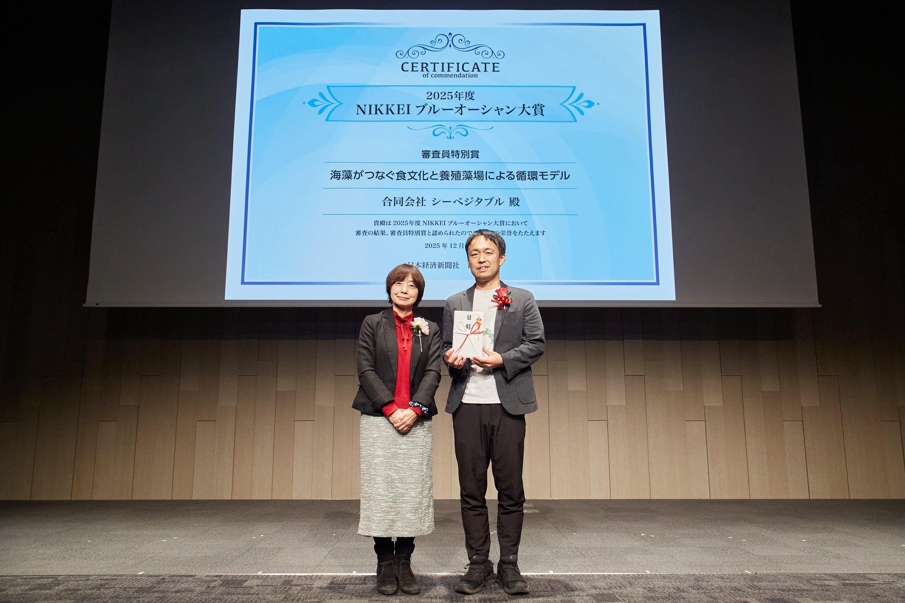 合同会社シーベジタブル(共同代表:蜂谷 潤、友廣 裕一、本社:高知県安芸市)は、2025年度「NIKKEIブルーオーシャン大賞」において、海藻の生産技術を軸にした環境再生と食文化の創出が評価され、審査員特別賞を受賞しました。本賞は、海洋環境の改善に寄与する取り組みを表彰するもので、海藻を軸にした循環モデルを推進するシーベジタブルの取り組みが高く評価されました。