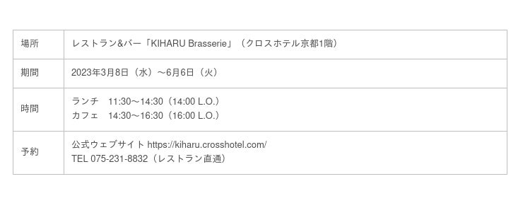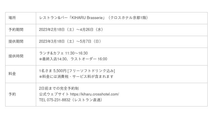 KIHARUと春の素材が出合った喜びと春になるウキウキ感を詰め込んだ季節のメニューをお届けします。今春よりランチコースを主体に、普段使いから特別なひとときまで多様なシチュエーションに対応するメニューへと一新。7種類から選べるパスタまたはリゾットにサラダ・スープがついたシンプルなコースから、5品を盛り合わせた前菜プレート、5種類から選べるメイン料理など全5品のプリフィクスランチまで4つのコースをご用意します。もちろん単品でのオーダーも可能です。また、ディナーも不定期で営業を予定しており、お酒のアテにぴったりなメニューをイタリアン、フレンチ、スパニッシュなどジャンルレスにお楽しみいただけます。