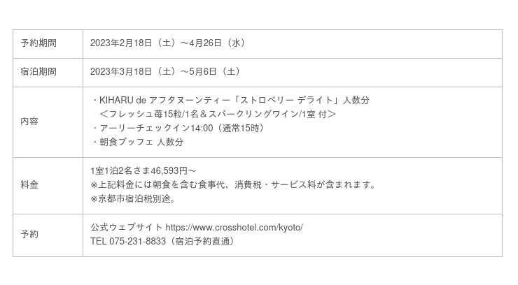京都・河原町三条にあるクロスホテル京都(所在地:京都府京都市中京区、総支配人:粂野 隆史)のレストラン&バー「KIHARU Brasserie」では、2023年3月18日(土)~5月7日(日)まで、旬の国産苺をふんだんに使い、苺を心行くまで楽しめるKIHARU de アフタヌーンティー「ストロベリー デライト」をご提供します。また、予約は2023年2月18日(土)より開始します。