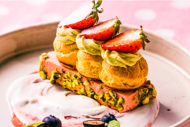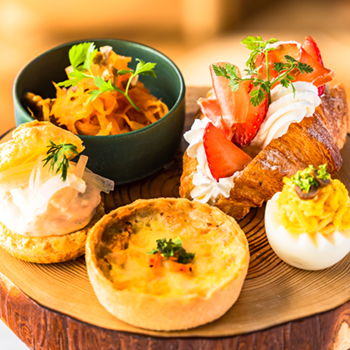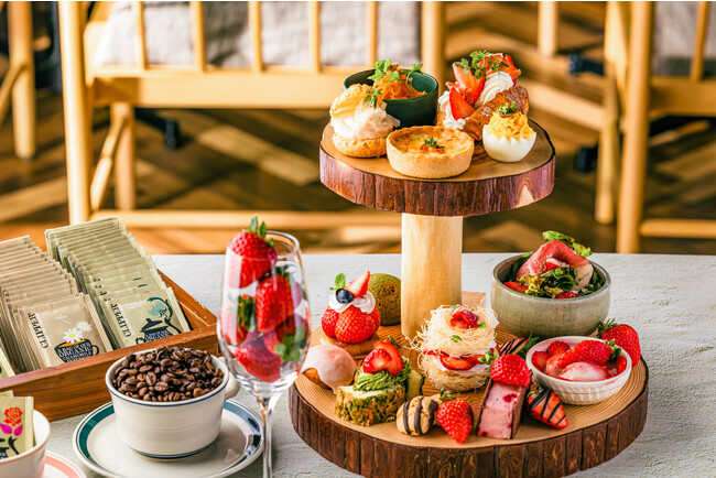 スイーツには、軽い苺ムースをチョコクッキーで挟んだ「苺ムースのチョコサブレサンド」、カダイフのサクサク食感が楽しい「苺のミルフィーユ」など6品をご用意します。セイボリーには、塩気のあるマスカルポーネクリームと苺を合わせた「苺とマスカルポーネと生ハムのサンドウィッチ」、チーズを練りこんだシューが香ばしい「自家製トラウトサーモンクリームのグジェール」など、ブラッセリーならではの本格的な品々をお届けし、京都北山杉で作られたオリジナルのティースタンドでご提供します。