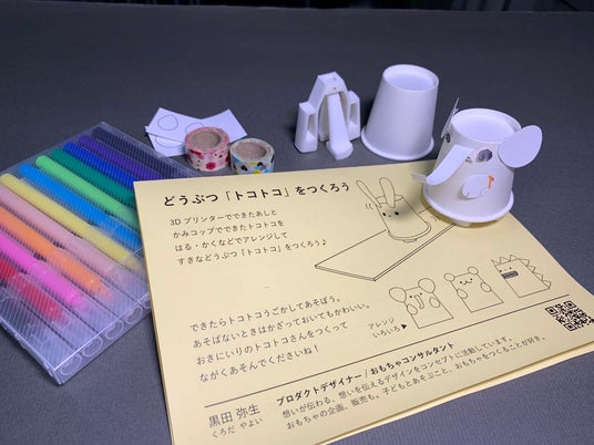 3Dプリンターでつくった足の部品と紙コップをテープでとめて、坂道をリズミカルに歩く「トコトコ人形」。紙コップに絵を描いたり、はさみで切ってパーツを貼ったり、シールなどでデコレーションして世界に一つだけのオリジナル「どうぶつトコトコ」をつくります。また、完成した「トコトコ人形」で遊べるスペースも設ける予定です。