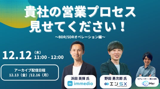 株式会社immedio(本社:東京都港区、代表取締役社長:浜田 英揮)が、2024年12月12日(木)、13日(金)、16日(月)の3日間渡って開催されるオンラインセミナー「貴社の営業プロセス見せてください! ~BDR/SDRオペレーション編~」に登壇します。