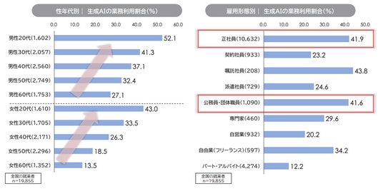 4. 若年男性が先行、20~30代男性は4割超だが、30代以上の女性・高齢層では低水準:性年代別では若年層ほど生成AIの利用割合が高く、特に20~30代男性は4割超と突出している。一方、30代以上の女性や高齢層では利用割合が低く、60代女性では1~2割台にとどまる。また、雇用形態では正社員や公務員で利用が進む一方、パート・アルバイトや自営業では低水準であり、年代・性別・雇用形態に応じた利用格差が顕著であることが確認された。