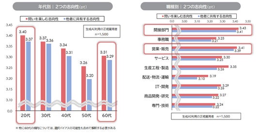 年代別にみると、20代で「問いを楽しむ/他者に共有する」志向性が高く、年代が上がるにつれて緩やかに低下し、60代でやや回復する。職種別にみると、「間接部門」や「営業・販売」のほうが志向性が高く、全体として「問いを楽しむ志向性」が「他者に共有する志向性」をわずかに上回る。一方で、「配送・物流・運輸」では「他者に共有する志向性」が相対的に低い。