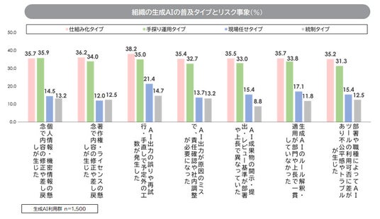 活用が進むタイプほど、リスク事象が表面化しやすい:生成AIによるリスク事象の発生率は、「仕組み化タイプ」、「手探り運用タイプ」で高い。「仕組み化タイプ」については、生成物の共有やレビューのプロセスの中でリスクが顕在化していることが想定される。「統制タイプ」は活用度そのものが低く、リスク発生率も低い。