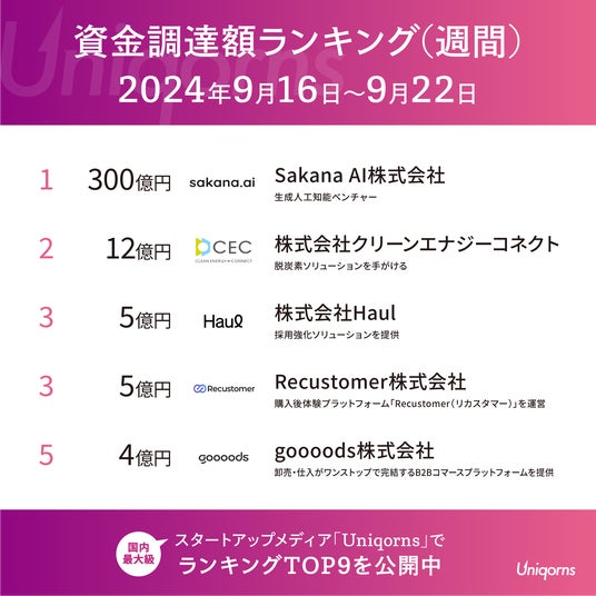 国内最大級のスタートアップメディア「Uniqorns(ユニコーンズ)」が2024年9月16日~9月22日のスタートアップ資金調達状況をランキング形式で発表