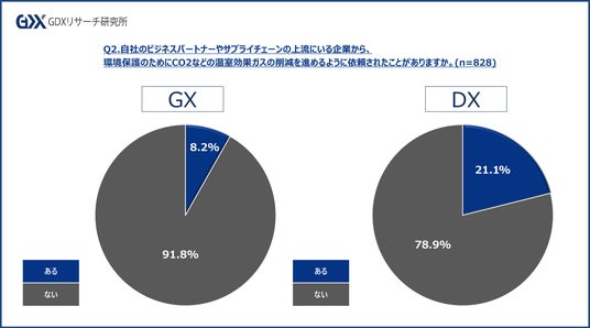 また、自社のビジネスパートナーやサプライチェーンの上流にいる企業から、環境保護のためにCO2などの温室効果ガスの削減を進めるように依頼されたことがあるか聞いたところ、「ある」と回答した企業が8.2%となり、上流企業からGXに関する要求を受けている企業は1割未満となりました。
