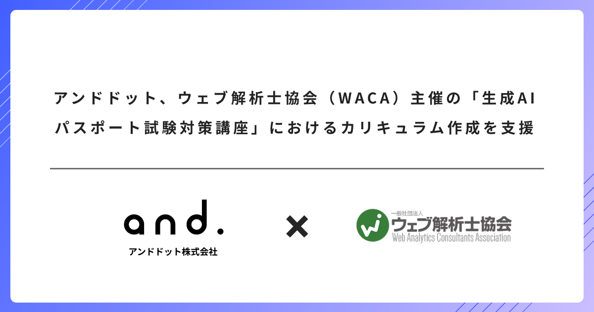 企業向けに生成AIソリューション事業を展開するアンドドット株式会社(本社:東京都渋谷区、代表取締役:茨木 雄太、以下「アンドドット」)は、一般社団法人ウェブ解析士協会(所在地:東京都新宿区、代表理事:江尻 俊章、以下「WACA」)が主催する、一般社団法人生成AI活用普及協会(理事長:井畑 敏、所在地:東京都港区、以下:GUGA)認定資格「生成AIパスポート」の公式試験対策講座において、カリキュラム作成を支援したことをお知らせいたします。 当社が法人向けソリューションで培った実践的な知見を本講座のカリキュラムに提供することで、国内のAI人材育成とデジタル変革の推進に貢献してまいります。