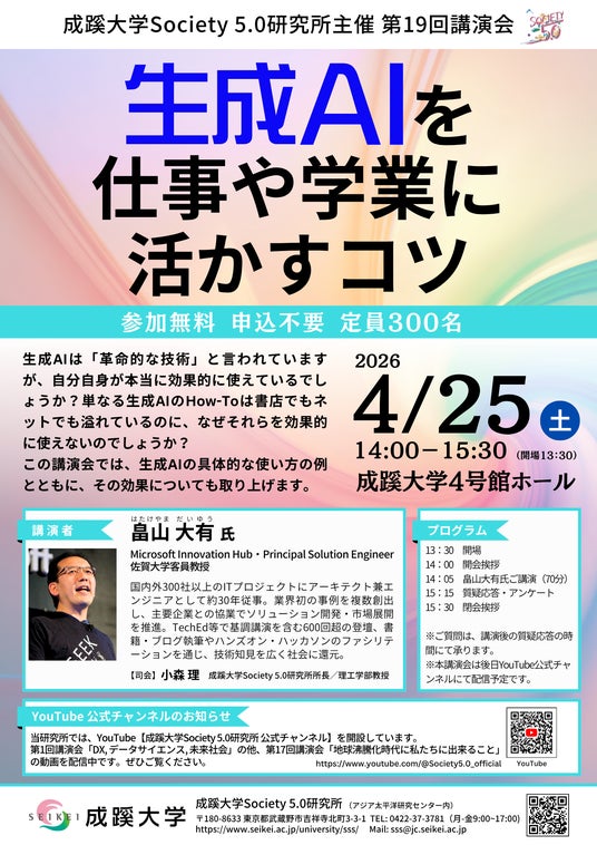 成蹊大学(東京都武蔵野市、学長:森 雄一)は、2026年4月25日(土)に成蹊大学Society 5.0研究所主催講演会「生成AIを仕事や学業に活かすコツ 」を開催します。当講演会では、Microsoft Innovation Hub・Principal Solution Engineerであり、佐賀大学客員教授でもある畠山 大有 氏をお招きし、講演いただきます。