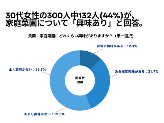 30代女性の300人を対象とした「家庭菜園にどれくらい興味がありますか?」というアンケートで132人(44%)が「家庭菜園について興味あり」という結果になりました。