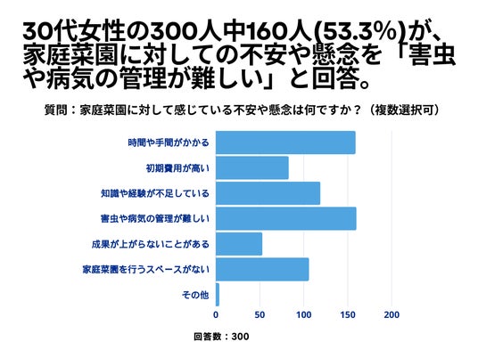 30代女性の300人を対象とした「家庭菜園に対して感じている不安や懸念は何ですか?」というアンケートで160人(53.3%)が「害虫や病気の管理が難しい」という結果になりました。