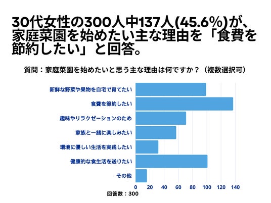 30代女性の300人を対象とした「家庭菜園を始めたいと思う主な理由は何ですか?」というアンケートで137人(45.6%)が「食費を節約したい」という結果になりました。