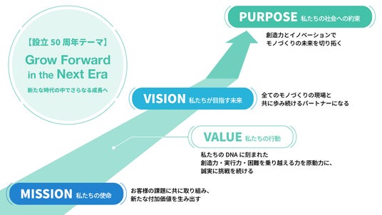 この節目にあたり、当社は「Grow Forward in the Next Era ―新たな時代の中でさらなる成長へ―」を50周年のテーマとして掲げました。これは、これまで培ってきた技術力や価値観を大切にしながら、生成AIの普及やデジタル化の進展を背景に、社会や産業構造が大きな転換期を迎えるなど変化の激しい時代の中で、モノづくりの高度化・精密化・効率化へのニーズに応えつつ進化を続け、次の時代を切り拓いていくという、私たちの決意を表しています。