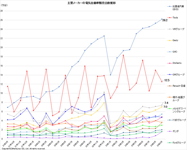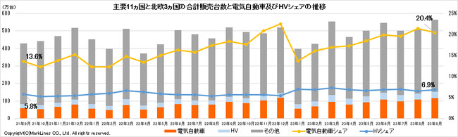 マークラインズ株式会社(本社:東京都千代田区、代表取締役社長:酒井 誠、http://www.marklines.com/) は、電気自動車の世界販売の約90%をカバーする主要14カ国を対象にグローバル市場における電気自動車の台数情報及び販売動向を分析した2023年9月の電気自動車(BEV/PHV/FCV)販売月報(商用車を除く、推計値を含む)を掲載しました。