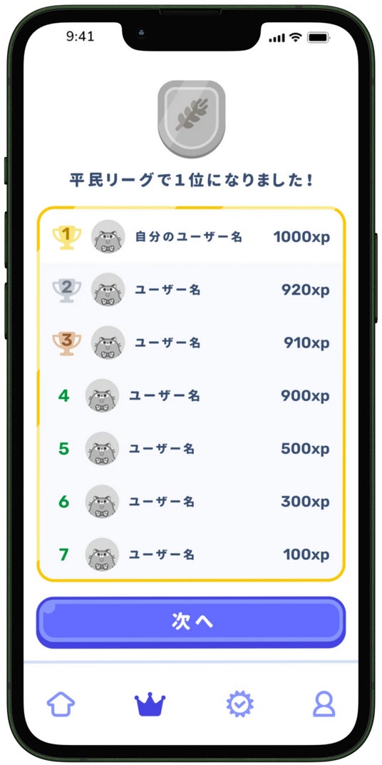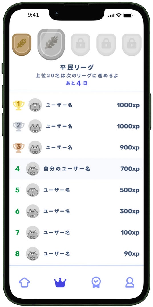 新たに導入されたリーグ制ランキング機能では、ユーザーは学習活動で獲得した経験値(XP)を1週間かけて競い合います。各リーグは10段階に分かれており、週ごとの成績に応じて上位リーグへの昇格を目指します。