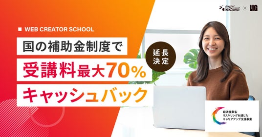 株式会社LIG(本社:東京都台東区、代表取締役社長 兼 CEO:大山智弘、以下 LIG)が運営するクリエイタースクール「デジタルハリウッドSTUDIO by LIG(通称:デジLIG)」において、昨年11月より開始していた「リスキリングを通じたキャリアアップ支援事業」の期間延長が採択されました。本事業では、個人のスキルアップとキャリアチェンジの支援を目的に、講座修了と転職を達成した方に受講料の最大70%が補助されます。